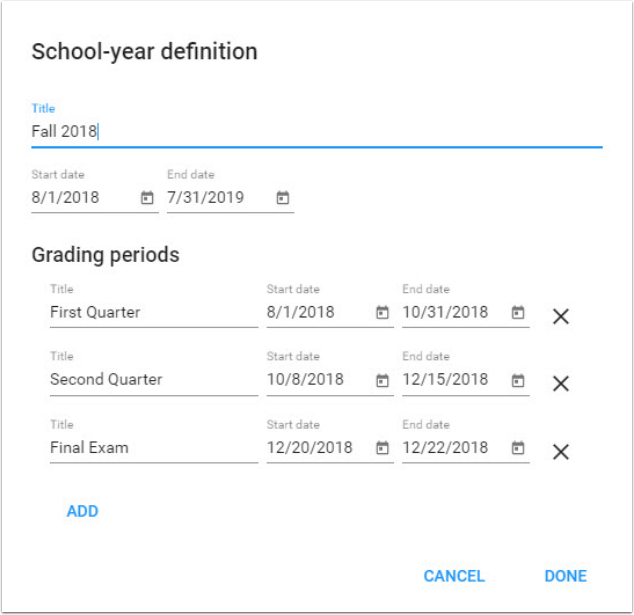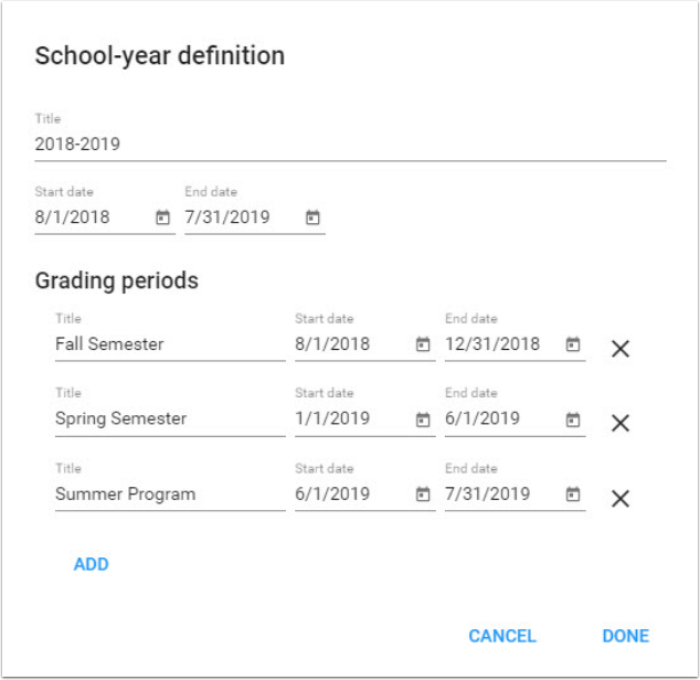 - Provide a Title for the term. For example "2018-2019", or for schools that don't use year-long courses, "Fall 2018".