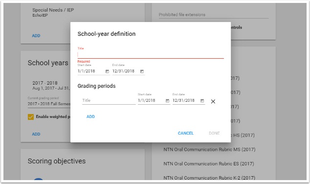 If you are a new school configuring school year and grading terms for the first time, it is recommended that the configurations of school year and grading periods be done at the district domain. Should your Echo Administrator need permissions to the district please contact Echo Support.