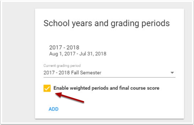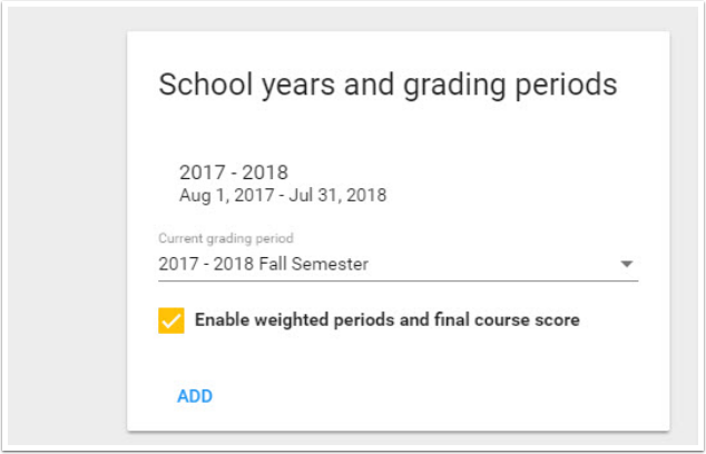 If weighted grading periods are to be used to calculate a final course score, the "Show course score in addition to period score" option must be enabled. Once enabled, the teachers can set the grading period weighting in their course settings and both the current grading period and the final weighted course score will be displayed throughout the app. Domain can be optionally configured to display both the current grading period's score and the final weighted course score.