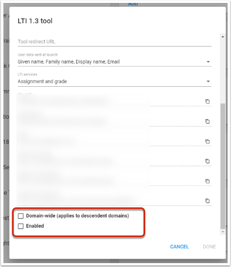 - Example: If you administer a district domain that has several child domains that are schools, you can configure the tool in the district domain, check this box, and all courses in all the school domains can use the tool without manually configuring the tool in each school domain. (Note: This feature is not available in 1.1 tools.)