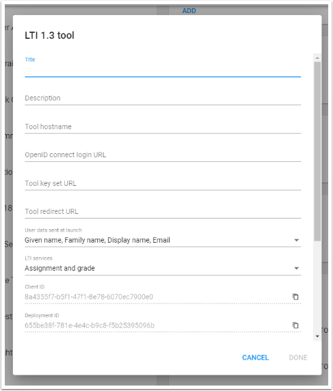 - The following fields provided by the tool: ClientID, OpenID connect login URL, Tool key set URL, Tool redirect URL.