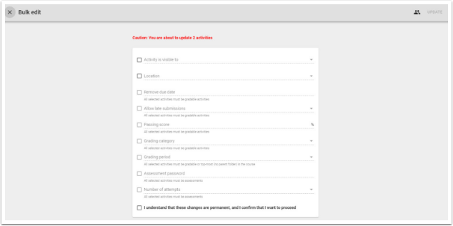 An additional popup window will appear with bulk edit options. Select what items need updating and check the box: I understand that these changes are permanent and I confirm that I want to proceed.