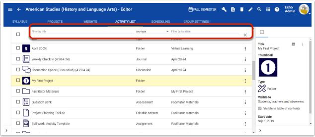 In the top panel, you can filter by activity title, type of activity, or location. If you'd like to update all items in a specific project, filter by location and use the folder name to find all of those items.