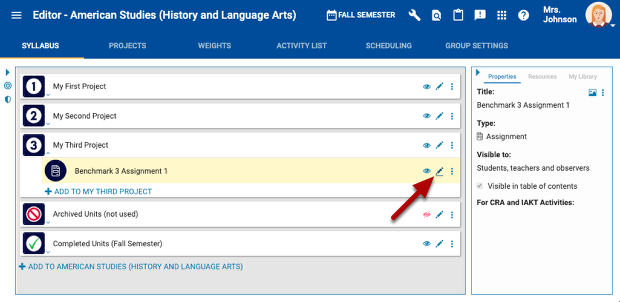 Locate the assignment that needs due dates adjusted for certain groups of students. Click the edit icon.